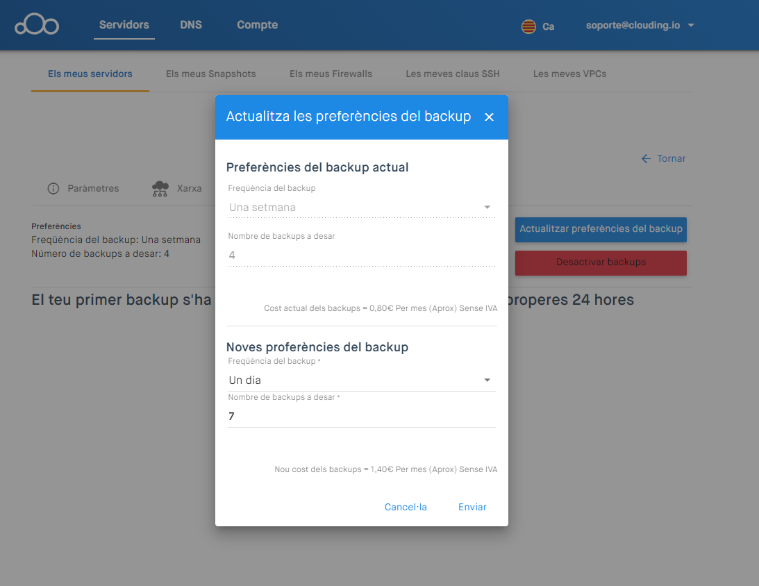 A la part inferior, a "Noves preferències del backup" escollim les noves característiques que desitgem per a les còpies de seguretat noves una vegada s'apliqui la nova configuració. En l'exemple, hem escollit 7 còpies de seguretat amb una freqüència diària. A "Nou Cost de les Còpies dels backup" podrem veure el preu actualitzat de la nova configuració de backup que hem seleccionat, en l'exemple 1.40€ Per mes (Aprox) Sense IVA.