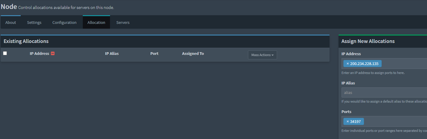 Un cop hagis creat l'assignació, podràs assignar-la a un servidor en el node corresponent. Això es fa des de la pestanya "Servers" (Servidors) al panell de control del node. Per tant, crea el nou servidor fent clic a la secció i al botó "Create New". Després selecciona el nom, una descripció i l'usuari del servidor: