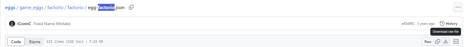 Ara podràs afegir l'egg per crear el servidor de Factorio, el primer serà descarregar el .json, dirigeix-te al link egg-factorio.json, Una vegada dins és tan senzill com prémer el botó de descàrrega, al posicionar el ratolí a sobre et sortirà directament "Download raw file"