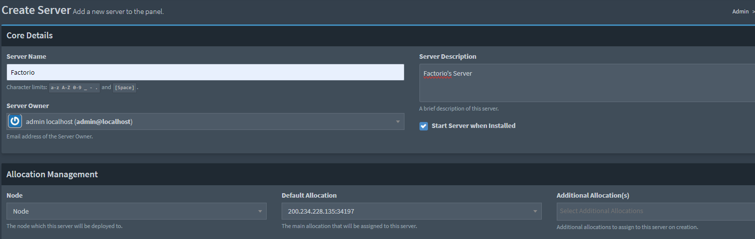 I finalment, fes clic a "Create Server" de la part inferior dreta. S'iniciarà la instal·lació automàticament i pots observar el procés sortint de "Admin Control" en el botó superior dret.