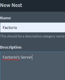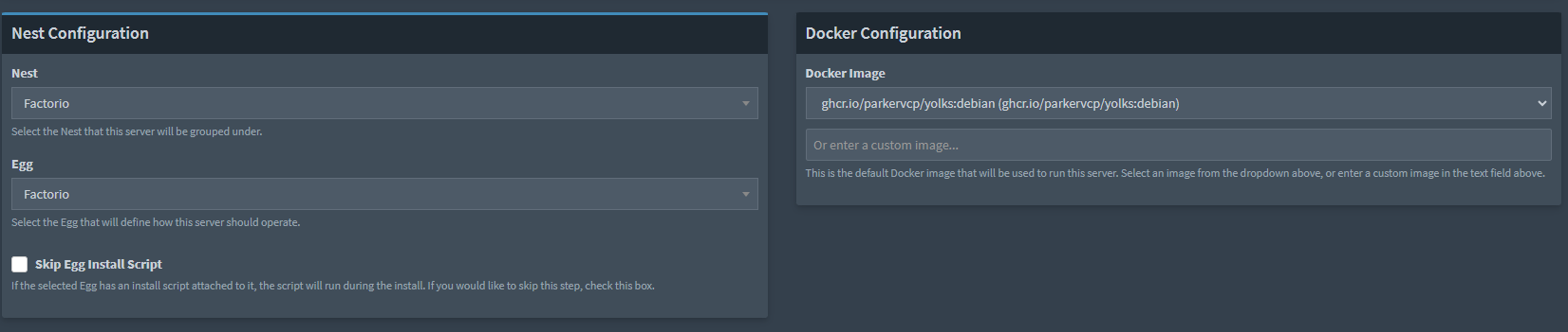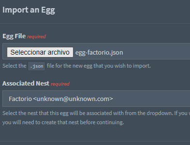 Per últim, selecciona el Nest i Egg desitjat. Pterodactyl admet per defecte diversos tipus de servidors, des de Minecraft fins a servidors de veu com TeamSpeak i Mumble. També pots importar altres Eggs a la secció Nests, per exemple els de parkervcp. Encara que en aquest article seleccionem un servidor Factorio: