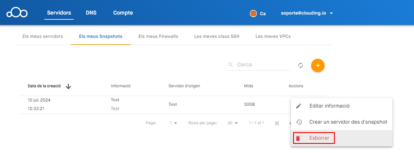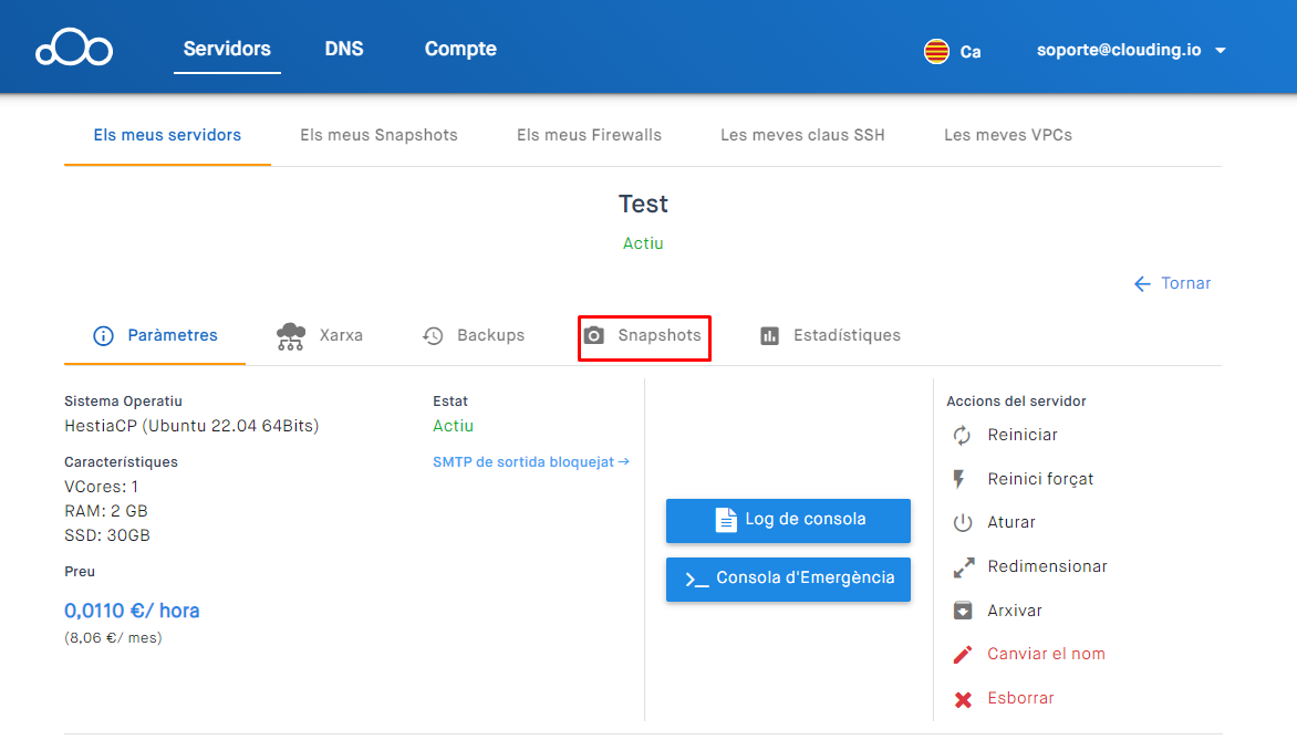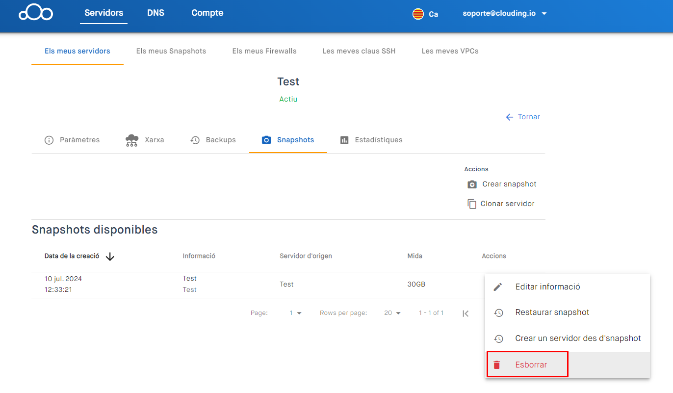 En la nostra plataforma podràs realitzar snapshots del servidor per a guardar una captura de l'estat del servidor en aquest moment específic (Com crear un snapshot del teu servidor) però, una vegada ja no el necessitis, podràs eliminar-lo sense cap compromís.