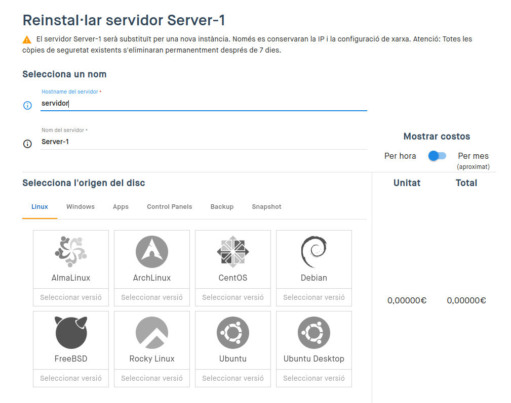 - Si el servidor té snapshots creats, es desvincularan en reinstal·lar el sistema operatiu i quedaran disponibles a l'apartat de Els meus Snapshots.