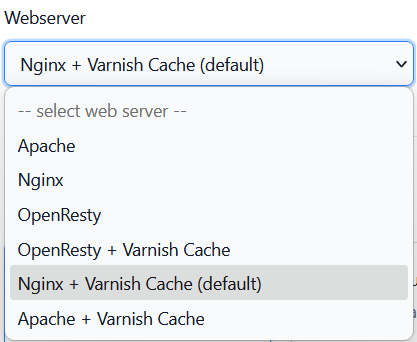 Webserver: OpenPanel proveeix diferents combinacions de servei web + memòria cau. Les opcions disponibles, a la data d’escriure aquest article, es mostren a la captura següent: