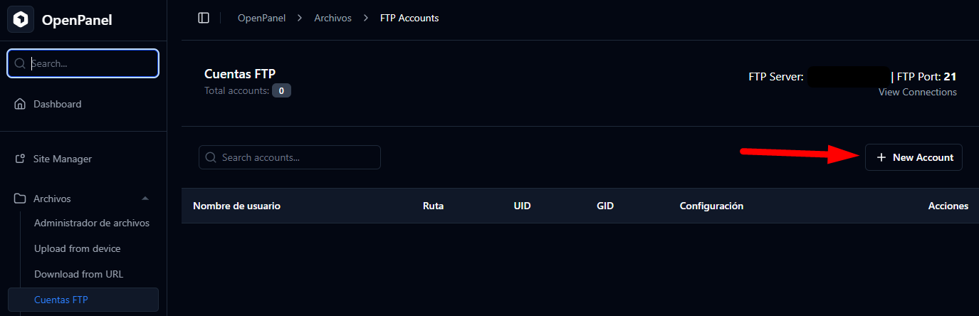 Dins de l'apartat Comptes FTP, veurem el llistat d'usuaris creats. Per afegir-ne un de nou, n'hi ha prou amb prémer el botó + New Account.
