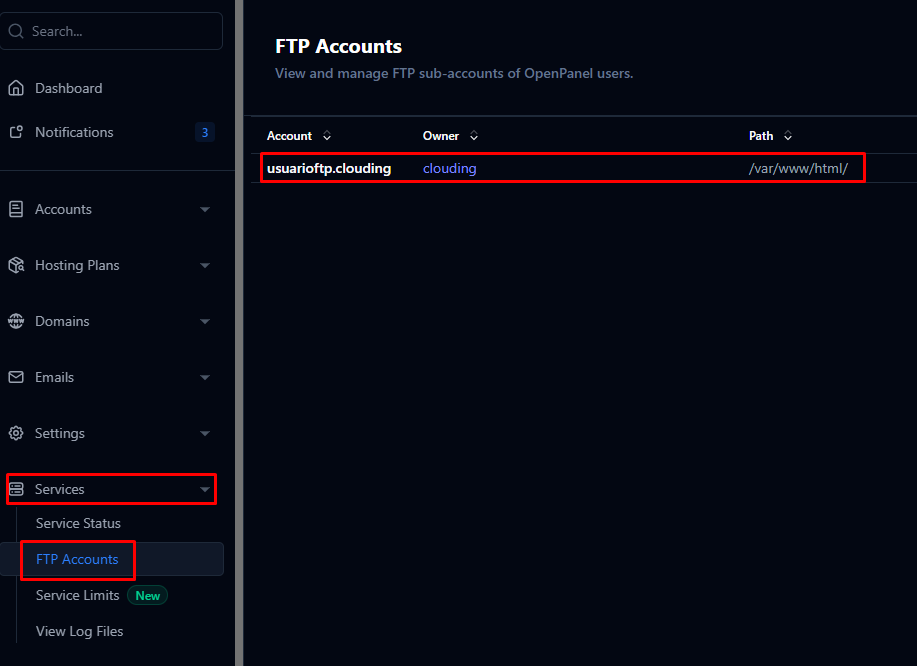 Per veure la informació de connexió FTP i administrar usuaris existents (per exemple, canviar contrasenyes, modificar la seva ruta FTP (el directori al qual estan limitats) o eliminar comptes), navegueu a OpenPanel > Services > FTP Accounts.