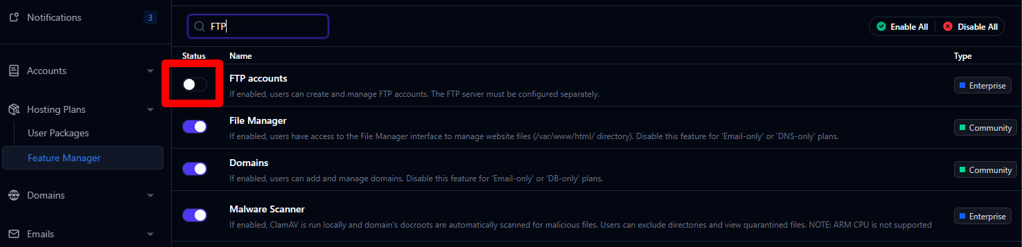 Després d'activar el mòdul FTP, el següent pas és assignar-lo a un pla d'allotjament o a un conjunt de característiques. Això es fa des de:hosting Plans > Feature Manager > Manage feature set