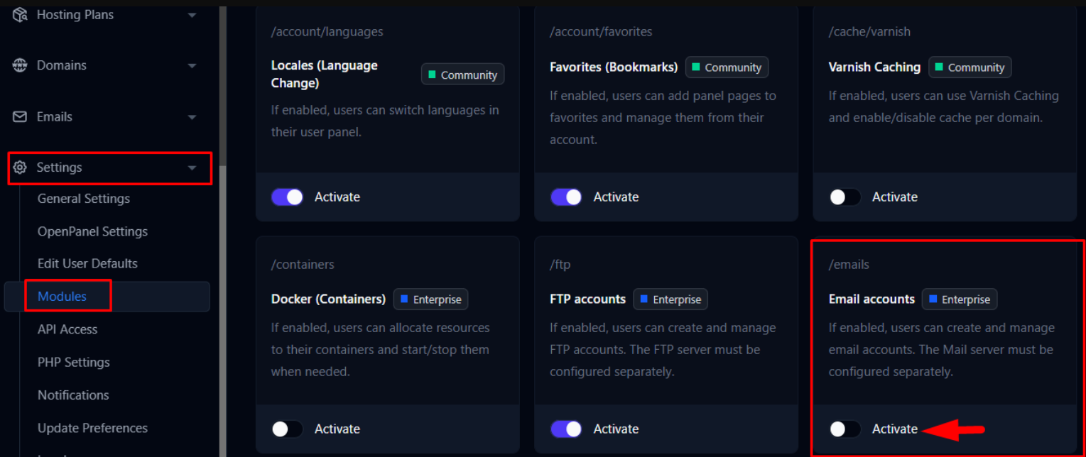 Abans de poder crear comptes de correu, cal activar el mòdul de correu electrònic des del perfil d’administrador.