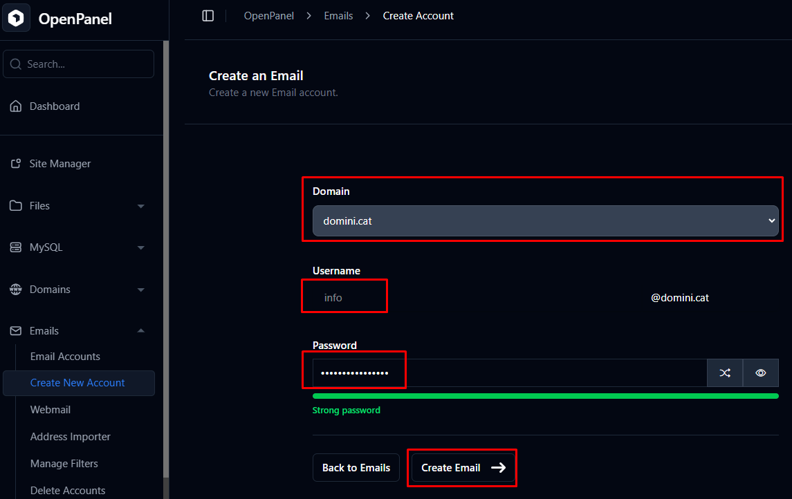 Create Email Account. - Selecciona el domini disponible a la llista desplegable.