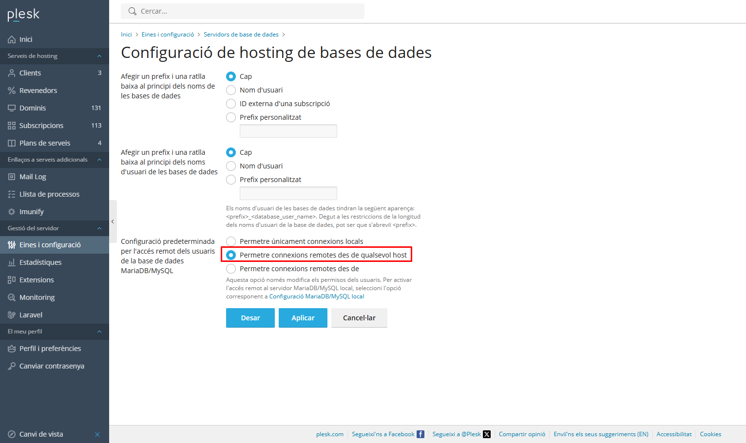 Primer accedirem a Plesk i anirem a Eines i configuració > Servidors de bases de dades > Configuració i després seleccionarem l’opció “Permetre connexions remotes des de qualsevol host“: