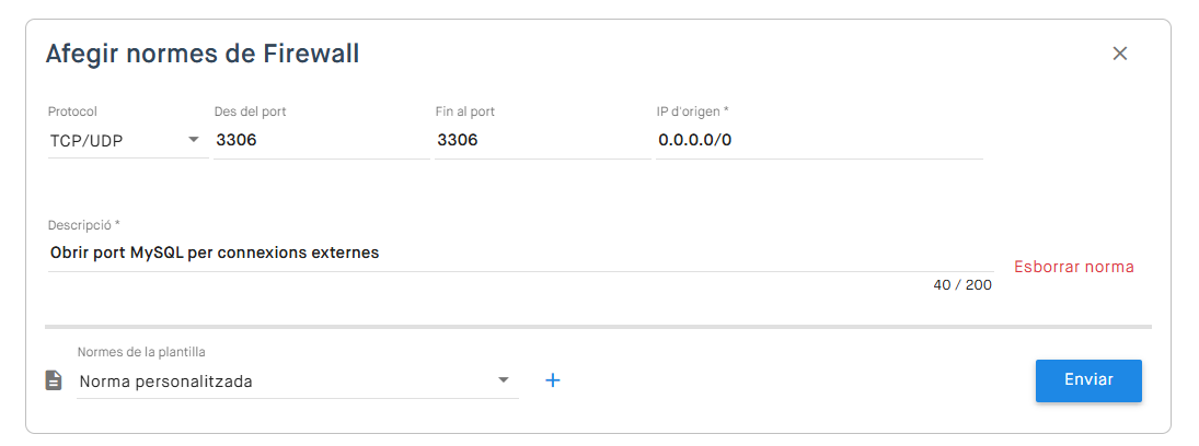Finalment haurem d’obrir el port al tallafoc de Clouding. Ens connectem al panell de Clouding i dins del servidor anem a la pestanya Tallafoc. Allà haurem d’afegir una regla nova. A IP d’origen podem afegir simplement la IP de la màquina que es vol connectar. En posar 0.0.0.0/0 estem permetent que qualsevol persona es pugui connectar utilitzant el port 3306: