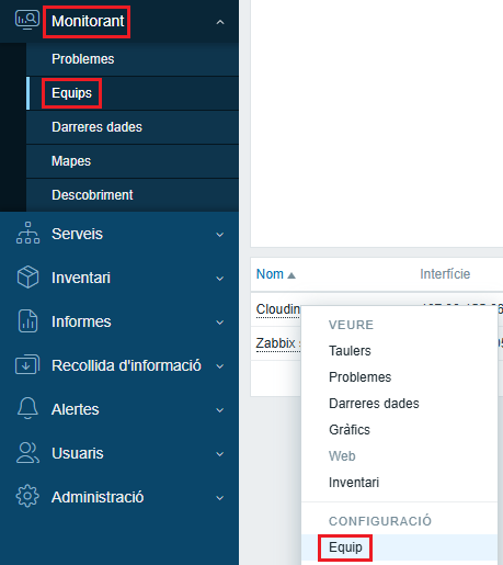 A la interfície de Zabbix, anem a Monitorant → Equips i seleccionem l'equip de l'agent. Al menú desplegable que s'obre premem Equip: