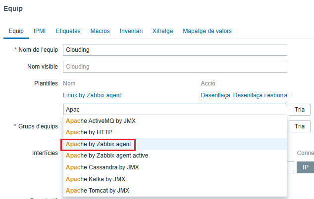A la nova finestra, seleccionem Apache by Zabbix agent al camp de Plantilles i actualitzem l'Equip: