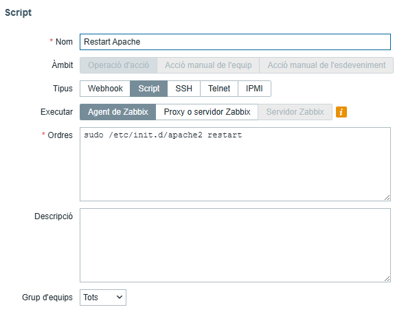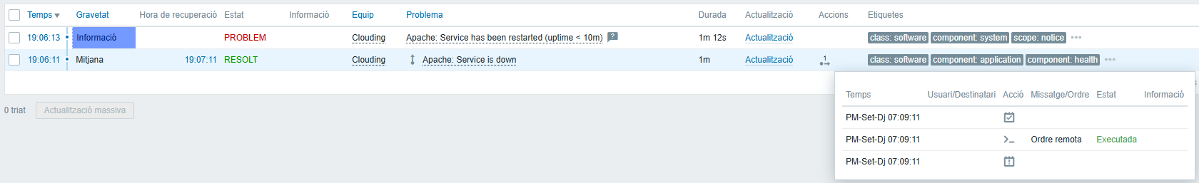 Amb aquesta configuració, Zabbix reiniciarà automàticament Apache al teu servidor en cas de fallada, assegurant la continuïtat del servei sense intervenció manual: