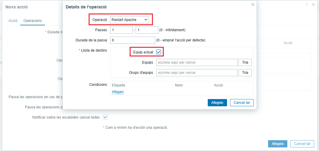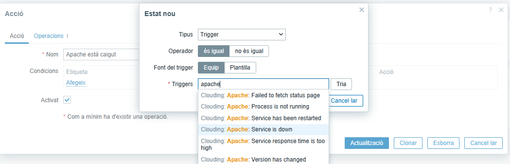 A Condicions, fem clic a Afegir i afegim la condició seleccionant a Triggers Apache: Service is down: