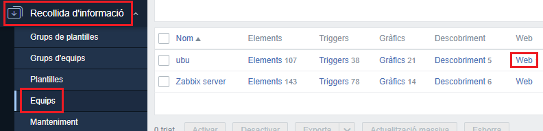 Accedim al panell de Zabbix i anem a Recollida d'informació i Equips i fem clic a Web al host on volem configurar la monitorització: