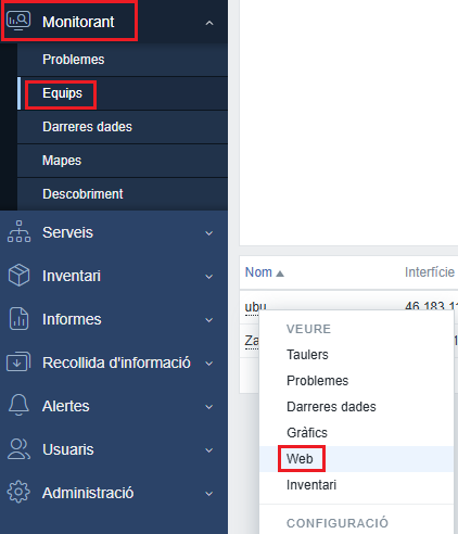 Amb aquests passos ja tenim la nostra pàgina web monitoritzada. Per veure si l'escenari funciona correctament anem a Monitorant i Equips, fem clic al host on hem configurat l'escenari i a Veure fem clic a Web: