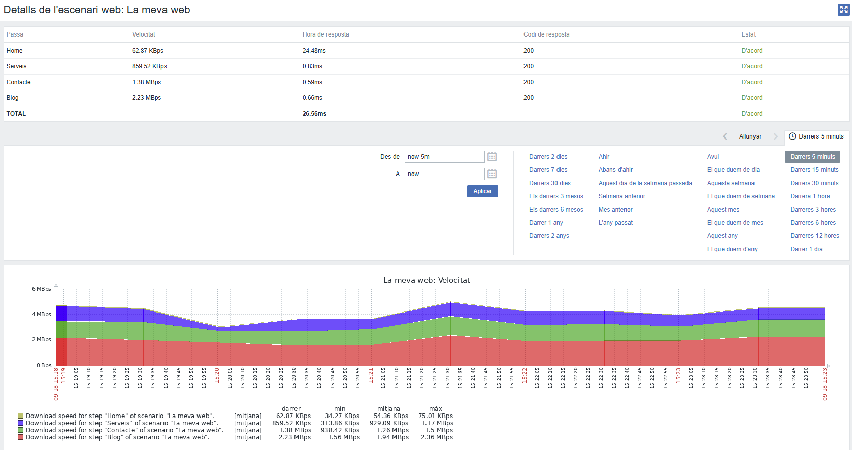Seleccionem l'escenari creat i Zabbix ens mostrarà mètriques com temps de càrrega, estat de cada pas, contingut detectat i gràfiques històriques: