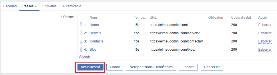 Cada cop que afegeixis o editis un pas a l'escenari, recorda prémer el botó Actualització perquè els canvis es guardin correctament. En cas contrari, Zabbix no tindrà en compte el pas en les pròximes execucions de l'escenari.