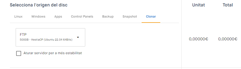 A Selecciona la configuració del servidor, hauràs de triar la quantitat de RAM, vCores i Disc SSD NVMe que assignaràs al servidor clonat. Tingues en compte que la mida del disc SSD NVMe ha de ser igual o superior al servidor original, no pot ser menor. Aquesta limitació no s’aplica a la quantitat de RAM i vCores, que pots ajustar lliurement. A la dreta podràs veure el cost de l’assignació de recursos, tant per hora com per mes.