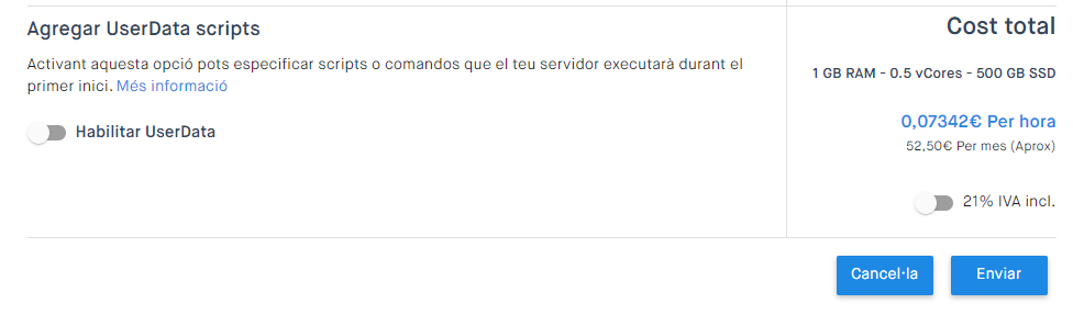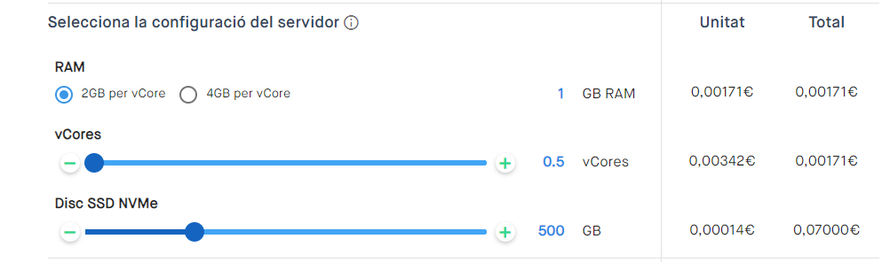Pots veure el preu del servidor clonat amb les característiques que hagis seleccionat, detallat tant per hora com per mes, i amb la possibilitat de consultar-lo amb o sense IVA.