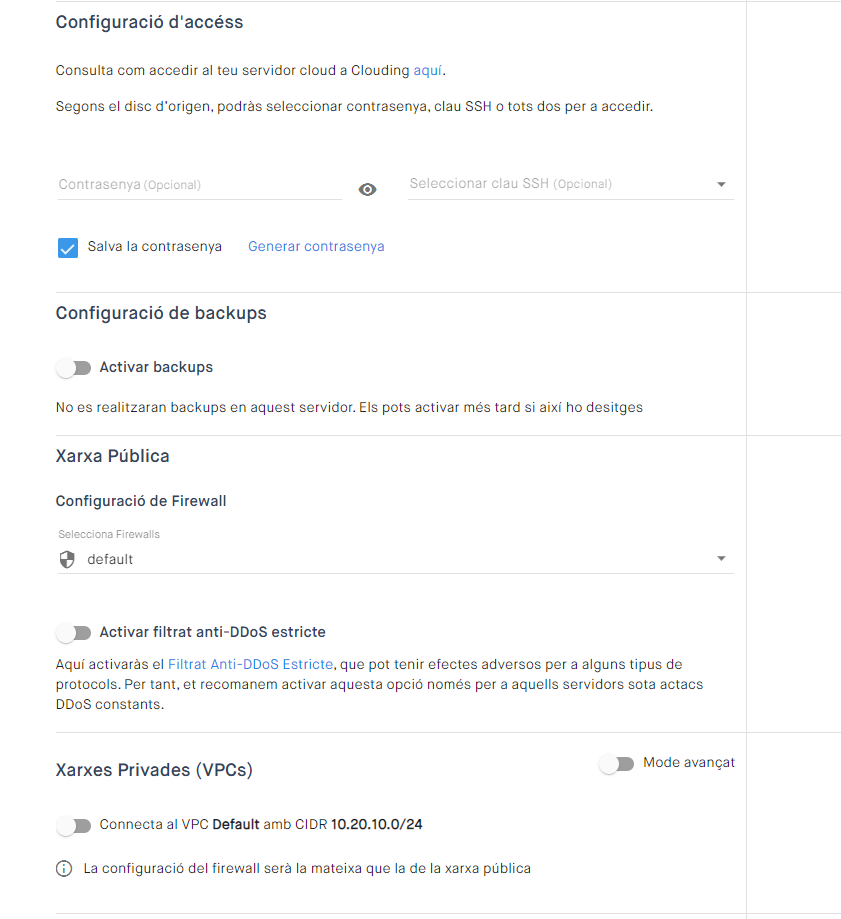 - A Xarxes Privades (VPCs) pots connectar el servidor a una xarxa privada configurada per defecte que et permetrà intercomunicar el servidor a través d'una Xarxa Privada (VPC) sense accés a Internet. Un cop creat el servidor pots crear més xarxes privades (VPCs) i assignar-les al servidor si ho necessites.