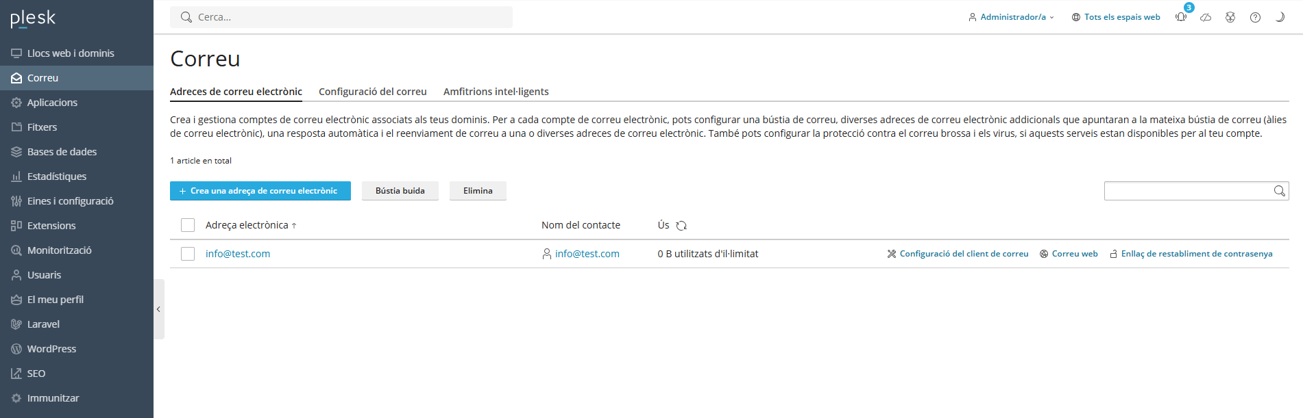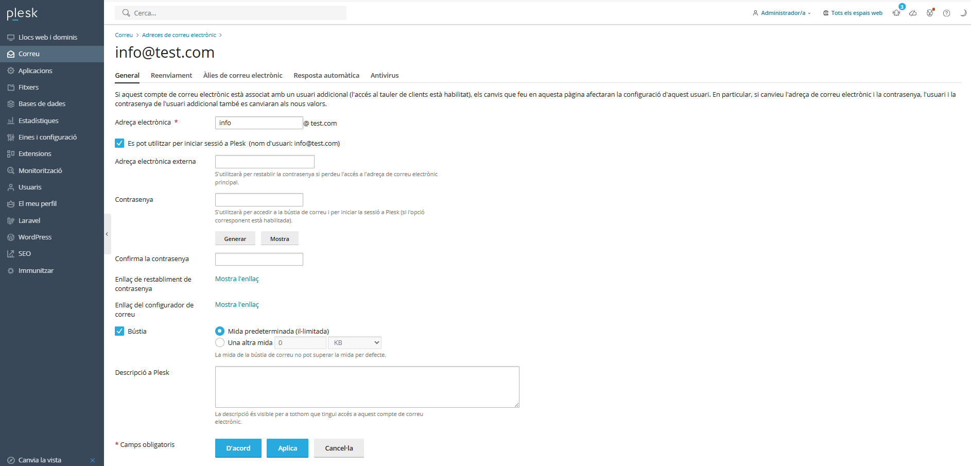 Passos a seguir per modificar la quota de la bústia de correu de Plesk