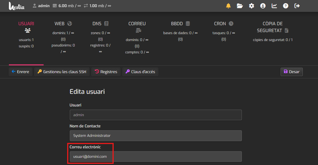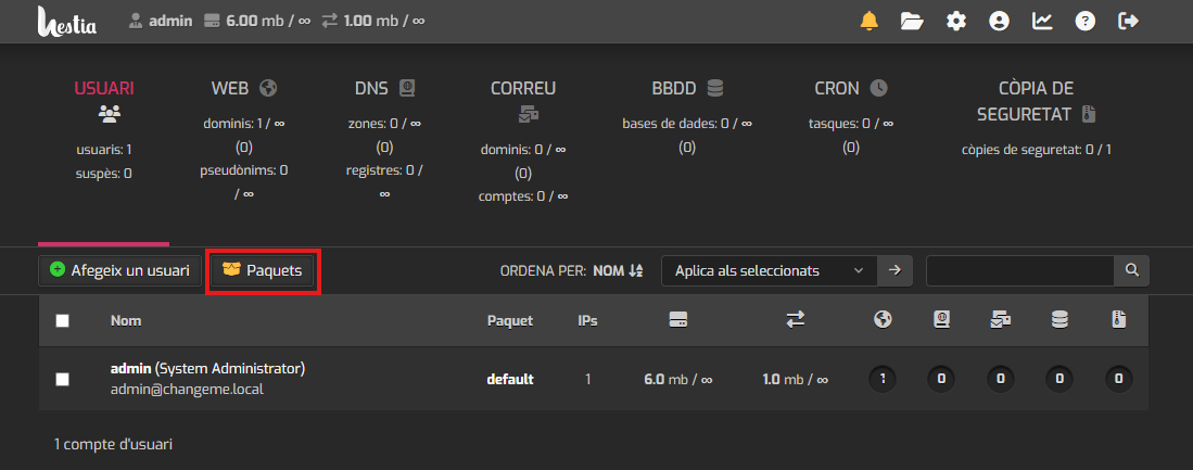 El primer que has de realitzar serà modificar l'e-mail del compte admin. Per defecte és admin@changeme.local i aquest e-mail no existeix; és un d'exemple. El que hauràs de fer és afegir el teu e-mail per a evitar problemes amb Let's Encrypt i rebre les notificacions del panell.