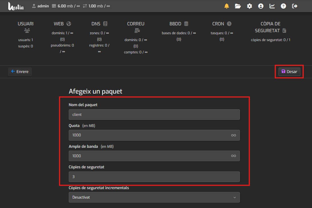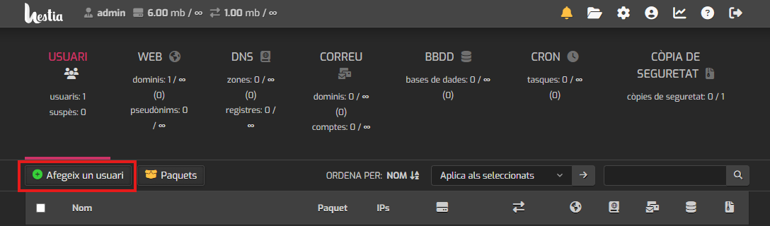 Per a configurar la retenció de les còpies de seguretat has de crear un nou pla des de l'apartat Usuaris: