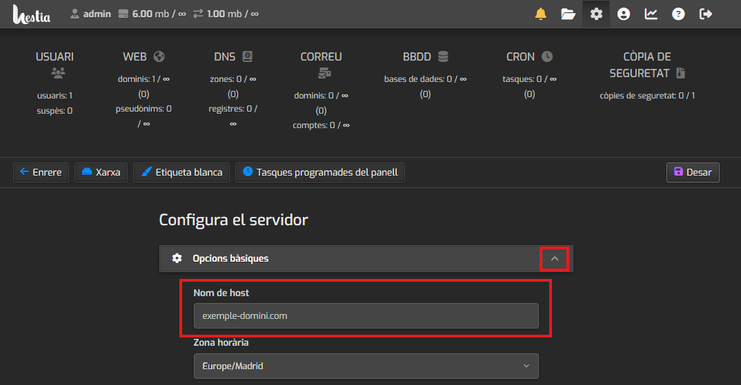 Aquí canviaràs el nom del Servidor (Hostname) desplegant l'apartat d'opcions bàsiques per un nom de domini que existeixi en el servidor i tingui un registre DNS per a ell: