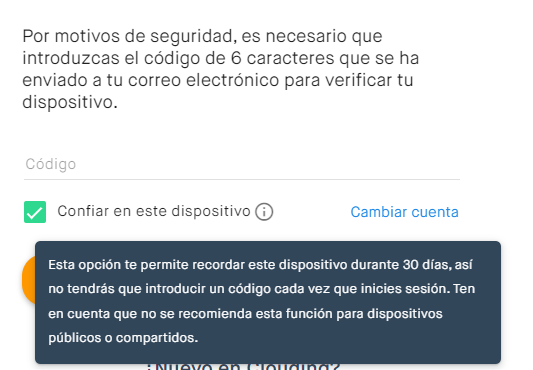 Clouding is committed to preventing unwanted login attempts, so each time you log in with your user account, verification is requested via a 6-character code sent to your email, or alternatively by the authentication application if you have 2FA (Two Factor Authentication) enabled.
