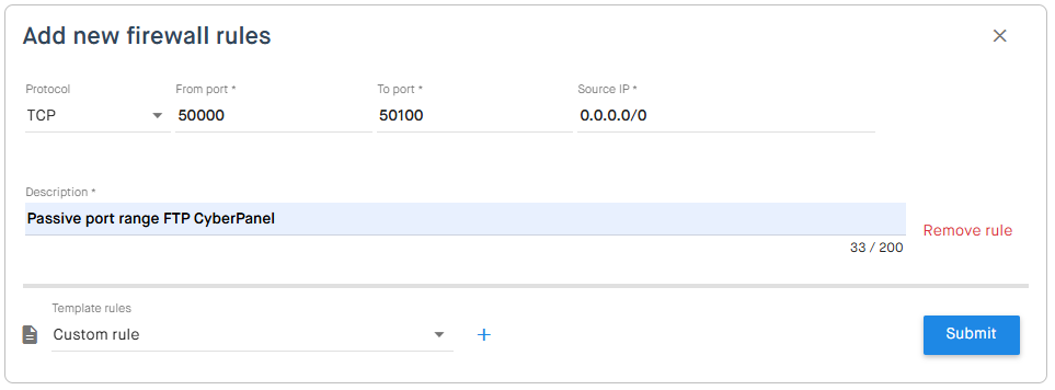 Once we have our passive port range defined we will have to open these ports in the Clouding firewall: