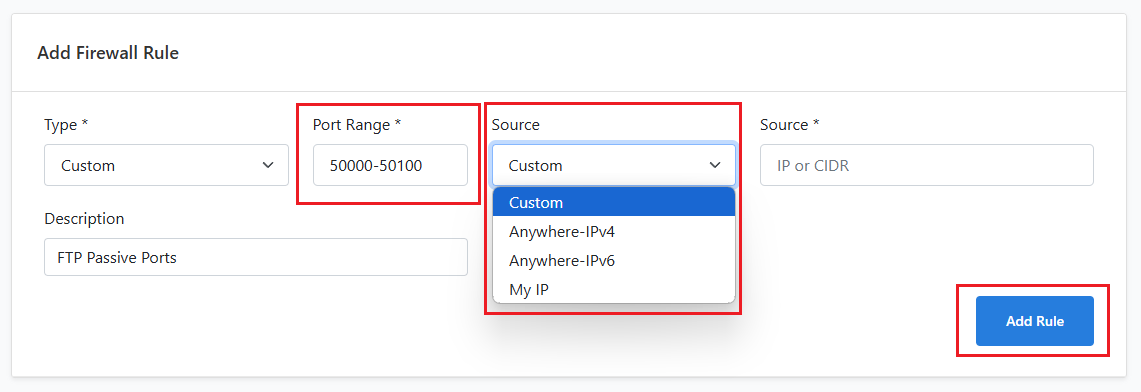 A form to Add Firewall Rules will open. In the Type field, select Custom and enter the range 50000–50100 in Port Range. In Source, you can restrict the rule to a specific IP or range or allow connections from any address: