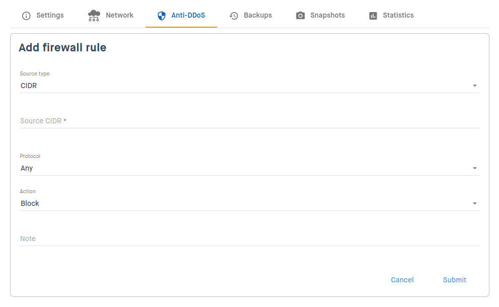 To create a new rule, click on the orange button on the right. In this section, you can create a rule to block a specific network (CIDR) or block traffic based on an ASN. The fields to fill in depend on the type of source you want to block or allow: