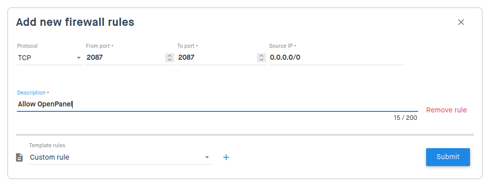 By default, port 2087 is not allowed in Clouding’s FW. It is the port to access the panel. To activate it, simply go to My Firewalls, in the FW configured for the server click the pencil icon and add the following FW rule (if you only want to access from your computer you can filter by IP):