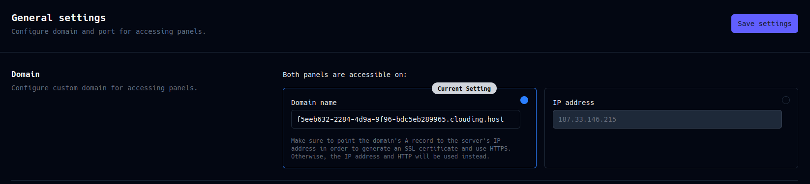 Something you will need to change is the server’s hostname. To do this, go to Settings - General Settings. In this section, the DNS address will appear by default, but you can change it to a domain or subdomain that points to the server.