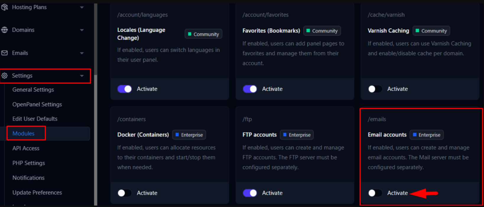 Enable the Email Service for Users in Hosting Plans