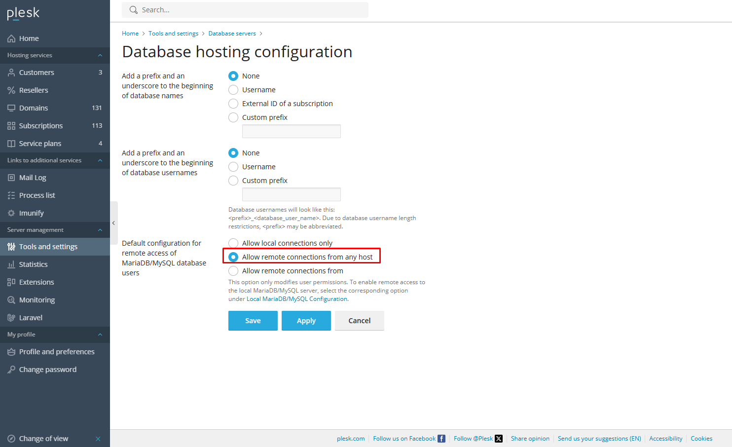 First, log in to Plesk and go to Tools & Settings > Database Servers > Settings, then select the option “Allow remote connections from any host“: