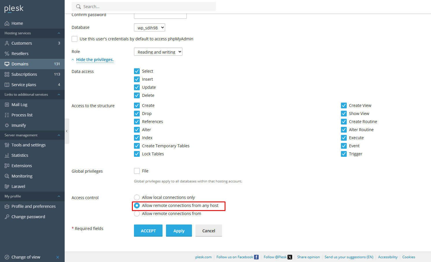 Next, go to Domains and click on the domain that has the configured database. Then go to Databases > Database Users and click on the user with permissions to manage the database. Make sure that the user also has the option “Allow remote connections from any host” selected: