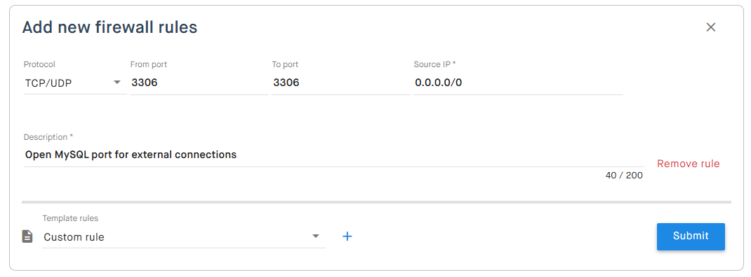 Finally, you must open the port in the Clouding Firewall. Log in to the Clouding Panel, go to the server’s Firewall tab, and add a new rule. In the Source IP field, you can enter the IP of the machine that will connect. By setting 0.0.0.0/0, you allow anyone to connect using port 3306: