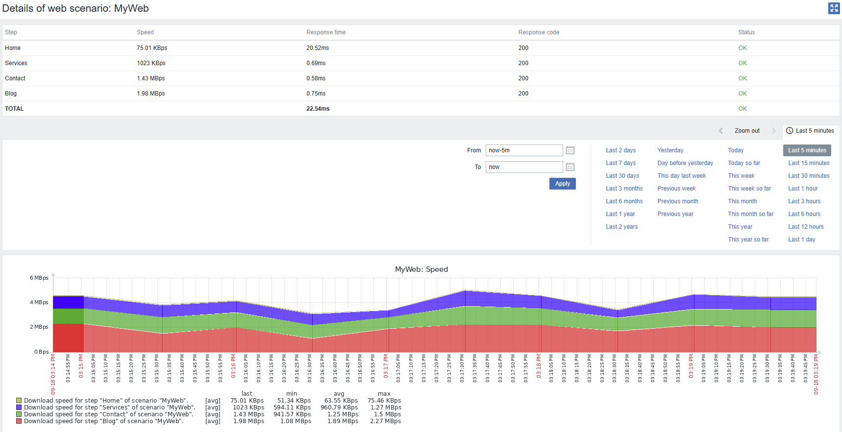 Select the scenario you created, and Zabbix will display metrics such as load times, the status of each step, detected content, and historical graphs: