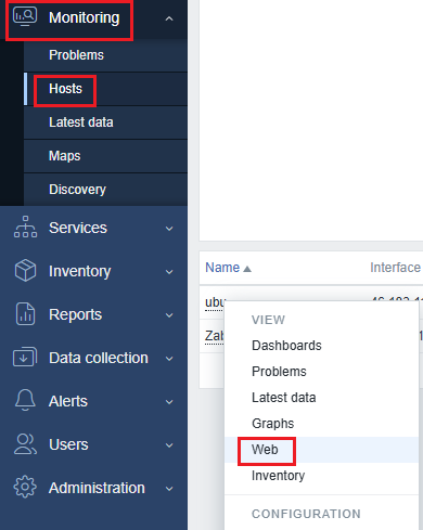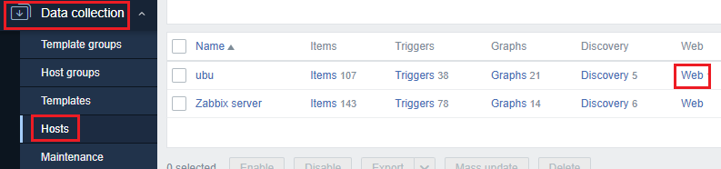 Access the Zabbix panel and go to Data collection and Hosts, then click on Web on the host where you want to configure monitoring: