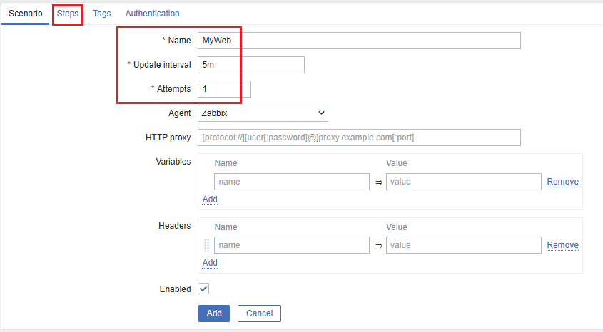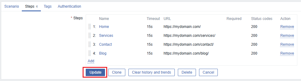 Each time you add or create a new step in the scenario, remember to click the Update button so that changes are saved correctly. Otherwise, Zabbix will not consider the step in the next scenario executions.