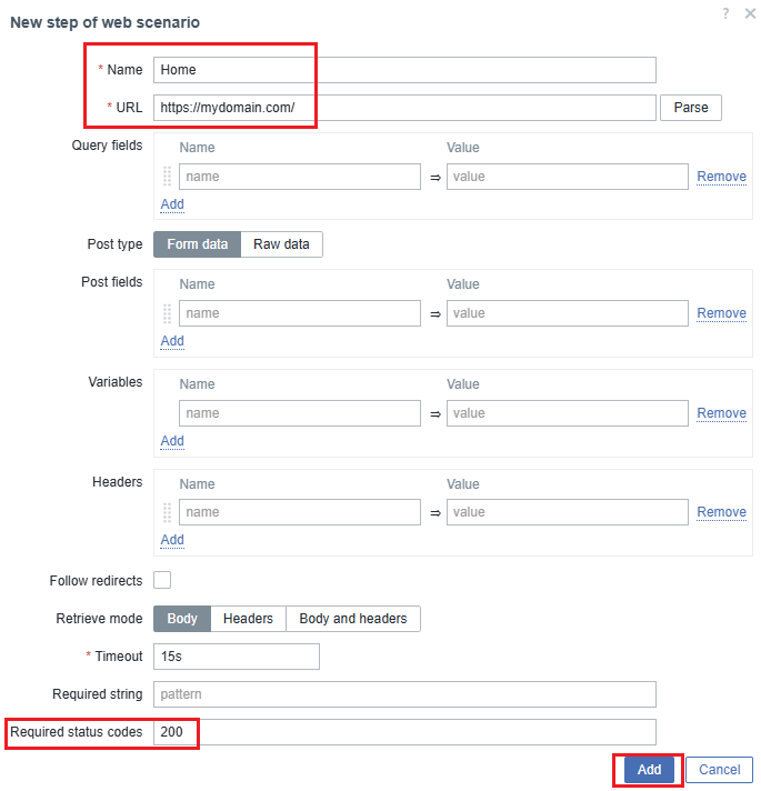 Required status codes correspond to the HTTP code returned by the web server in the response header. The usual code is 200, which means the request was processed successfully. If your application responds with other valid codes (e.g., 301 for redirects), you can also specify them here.
