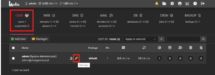 The first thing you need to do is modify the email of the admin account. By default, it is admin@changeme.local and this email does not exist; it is a sample. What you need to do is add your email to avoid issues with Let's Encrypt and to receive notifications from the panel.