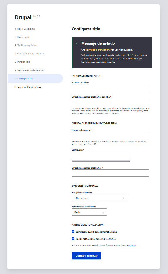 Selecciona el idioma deseado y haz clic en la pestaña de “Guardar y continuar”. Deberías ver la siguiente página: