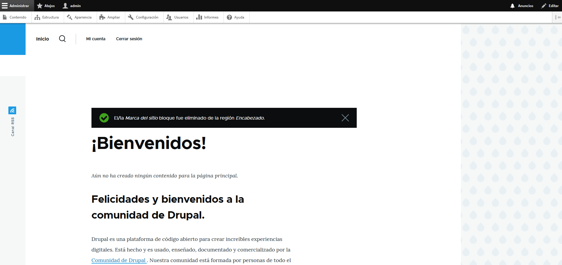 Una vez que haya terminado de configurar el sitio, deberías ver el panel de control por defecto de Drupal en la siguiente página: