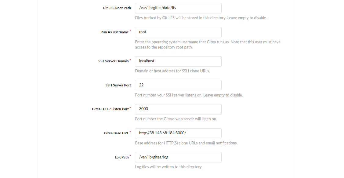 Si quieres utilizar Gitea con un domini personalizado, puedes modificar el aparado de Gitea Base URL con el dominio que quieras utilizar, en nuestro caso dejamos la IP por defecto (también podrás realizar estos cambios después en el fichero /etc/gitea/app.ini modificando domain y root URL):