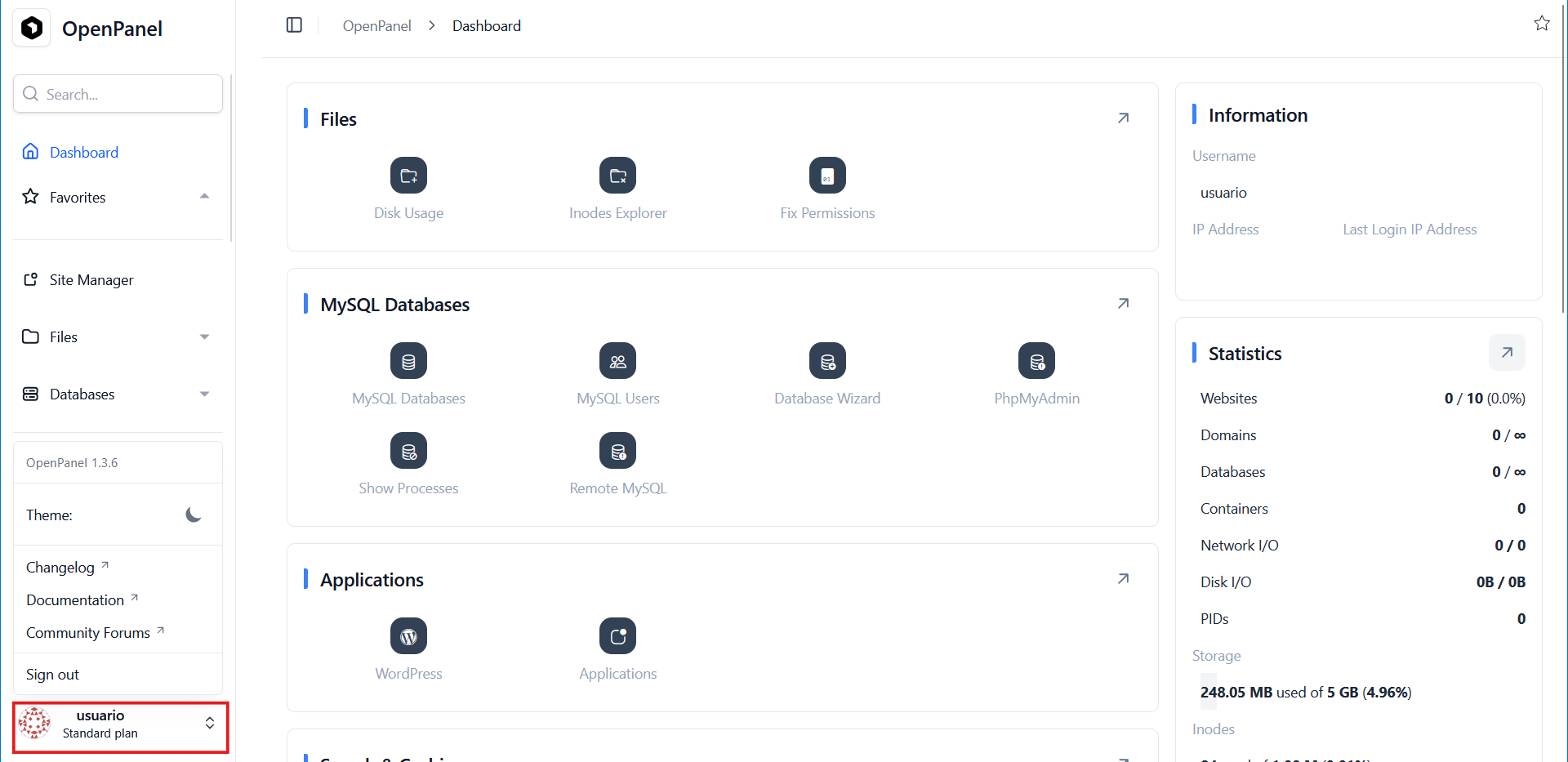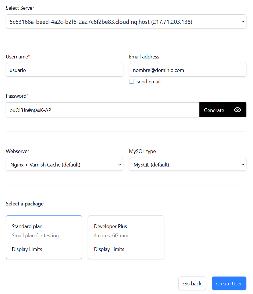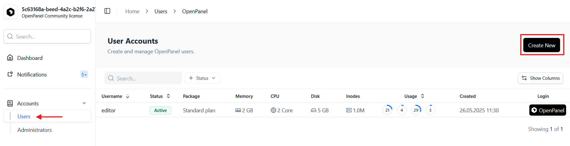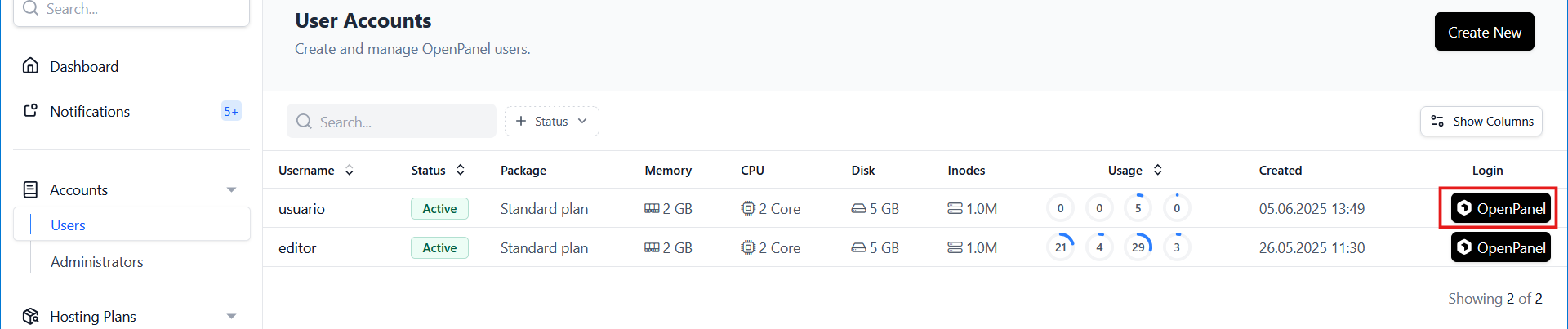 Crear un usuario nuevo en OpenPanel