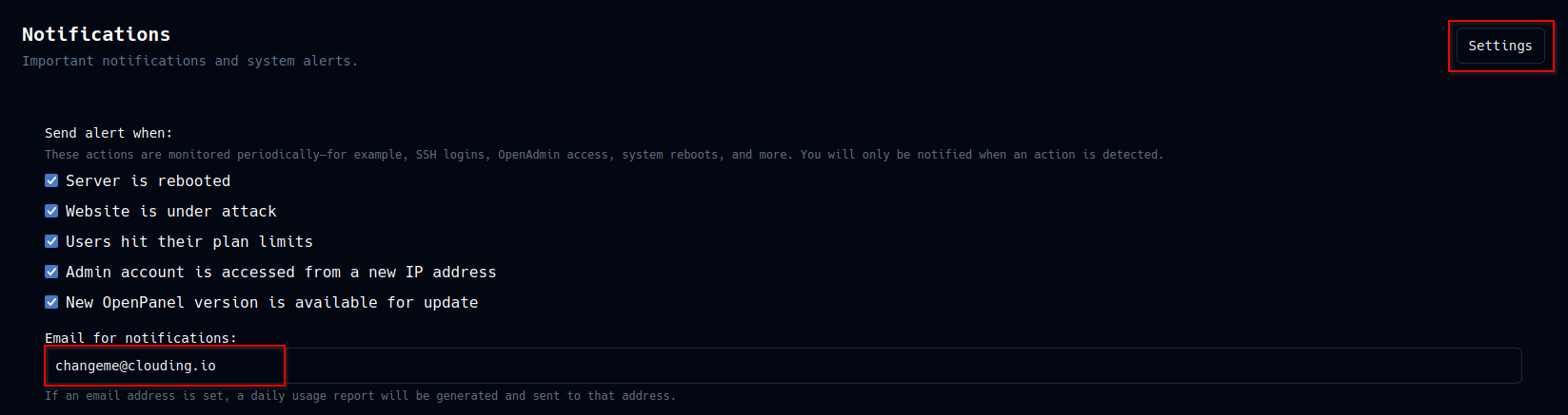 Tendrás que modificar la cuenta de correo electrónico del usuario admin para poder recibir notificaciones, para hacerlo en el menú haz clic sobre Notifications y luego haz clic sobre el botón de Settings. En ese apartado, podrás poner tu e-mail dentro del apartado Email for notifications:¡